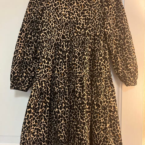 Denne kjole er fra mærket Name It og har et leopardmønster. Den har korte ærmer og en rund halsudskæring. Kjolen er afslappet i stil og er designet til størrelse 128. Den er velegnet til hverdagsbrug eller som en afslappet sommerkjole.