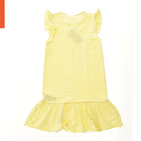 Kjole med lange ærmer og rund halsudskæring. Den er lyserød med et trykt mønster af jordbær og små hvide blomster. Kjolen har flæsedetaljer på skuldrene.