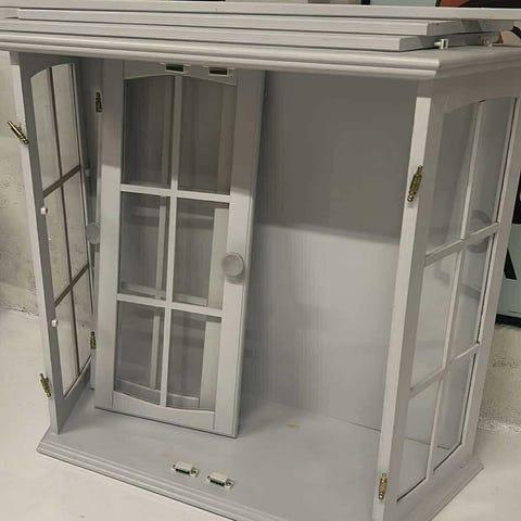 Gammelt fyrretræ vitrineskab til at hænge på væggen med en hylde inden i. 80x26 cm H40 cm.