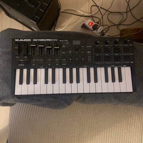M-Audio Oxygen 49 MIDI Keyboard Controller med 49 tangenter. Keyboardet har diverse kontrolknapper, fadere og pads til musikproduktion og livebrug. Farven er sort, og det er designet til at blive brugt som musikproduktionsudstyr.