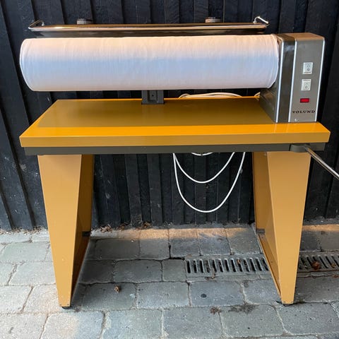 Elektrisk strygerulle fra Vølund. Der er for nylig skiftet ledning ved elektriker fra rulle til strømstik og fra rulle til pedal. Den fungerer godt, men er selvfølgelig præget af at være en gammel model.