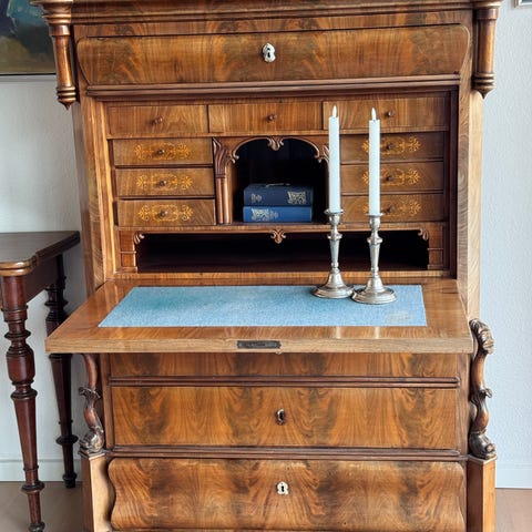 Antik sekretær med flere skuffer og et klapbord. Sekretæren har en klassisk udformning med detaljer som nøglehuller og dekorative elementer. Velegnet til opbevaring og som skrivebord i hjemmet.