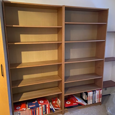 Hvide reoler lavet i træ gives væk, da sælger lod dem hænge i vores nye hus.