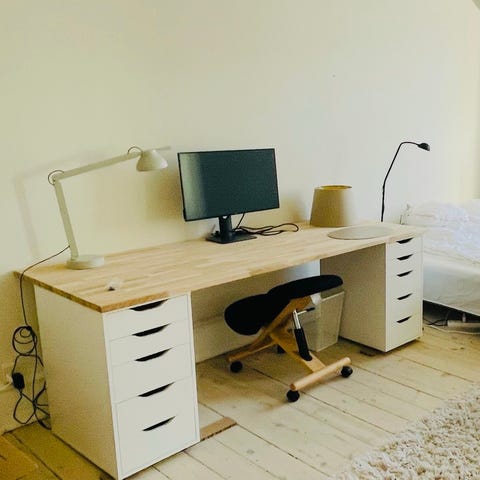 Består af kommoder fra IKEA og bordplade fra Trævarefabrikernes Udslag.