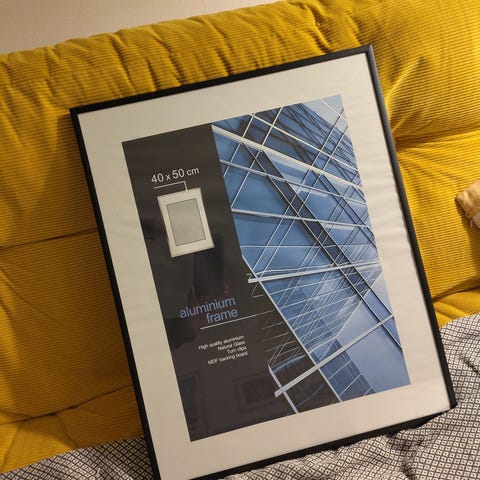 Stor billedramme på højkant - 60 cm bred og 73 cm høj - fast stål vire til ophæng og 10 clips til at holde billed mod glas