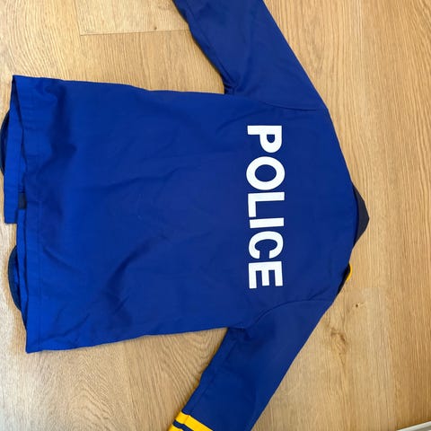 Politiuniform til fastelavn. Bukser og overdel (lukkes med velkro) samt kasket og politistav