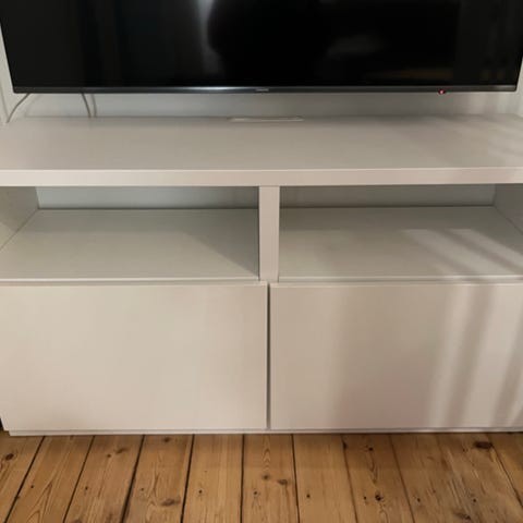IKEA Bestå TV-bord (væghængt) i hvid. Med 2 (flytbare) hylder og hvid top/glasplade der passer til TV-møbel.