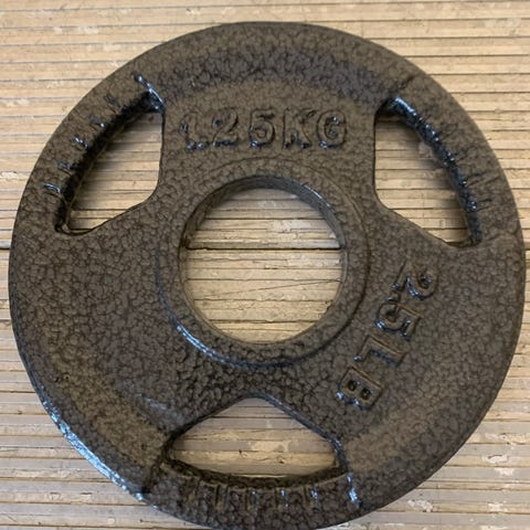 Ukendt vægtskive med en vægt på 5 kg, lavet af plastmateriale i lilla farve. Vægtskiven har håndtag til nem håndtering.