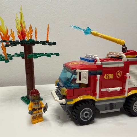 LEGO City brandbil med stige og tilhørende figur. Modellen er rød og inkluderer en bevægelig stige samt en førerfigur med hjelm. Sættet tilhører LEGO's City tema og er designet til leg og samling.