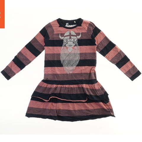 En langærmet kjole med brede striber i lilla nuancer. Blød og let kvalitet med print foran af vikingepigen Freja i sølvglimmer. Kjolen har et skørt med flæsedetaljer.