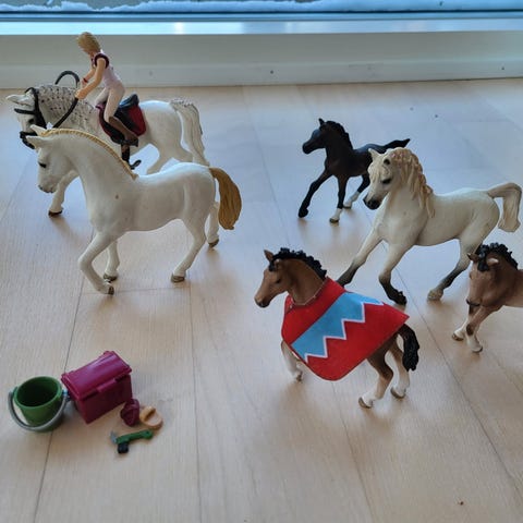 Der medfølger en hest en grime et dække et hovdetøj en sadel og to mennesker