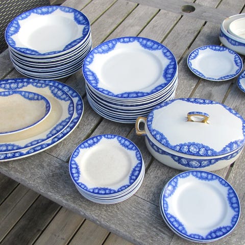 Fire smukke tallerkener, blå blomster bort på hvid bund, stellet Gudrun fra Villeroy & Boch.