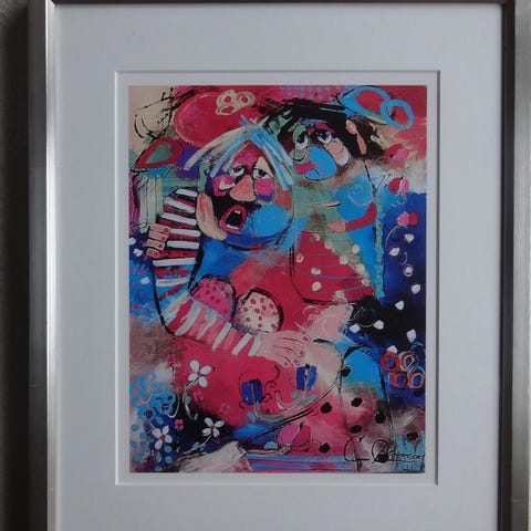 Stort flot og skønt billede af Conni Østergaard “Fru Violets verden”. Er i en træramme.