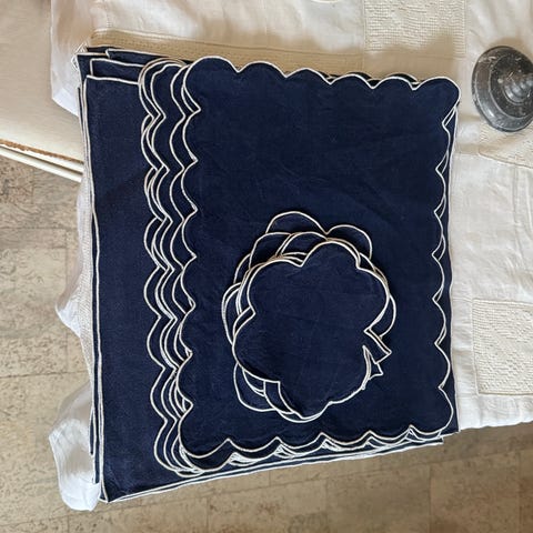 Sælger disse 4 blå stof dækkeservietter med Peter Plys motiv på den ene side og 101 Dalmatinere på den anden side.