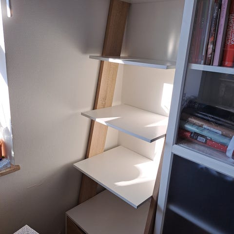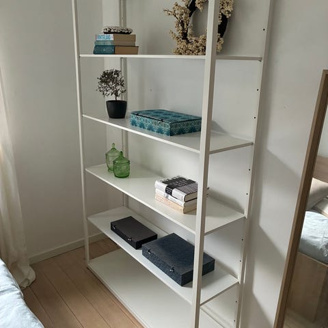 Elegant Oslo bookcase in white with oak structure – good condition, ideal for books, decor, or storage. Matches Oslo TV table perfectly. Has some light signs of usage on the top shelf and in the drawer where something was spilled.