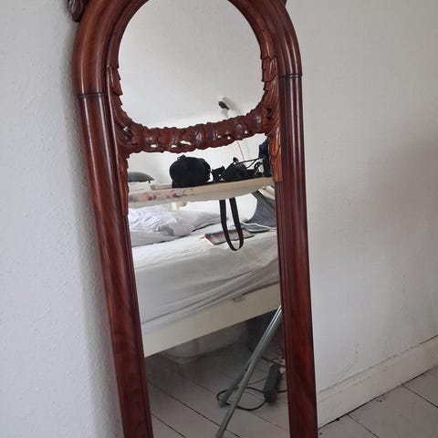 Pænt stort maghonispejl til at hænge f.eks i entre, hvor man kan se højden af en selv. Det kan naturligvis også hænge alle andre steder ;-)