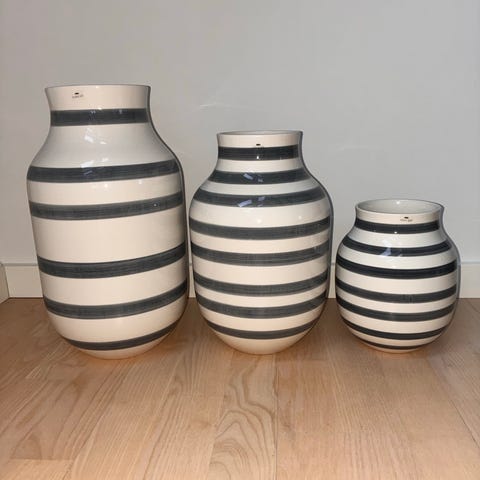Kähler vase sæt med striber i blå, sort og hvid. Sættet indeholder tre vaser i forskellige størrelser med et stribet mønster.