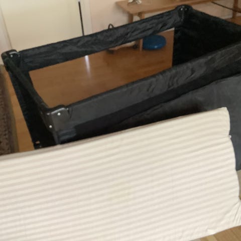 IKEA rejseseng til børn, der medfølger et par stræk lagener. Sengen har en sammenklappelig ramme med net på siderne for ventilation og udsyn. Velegnet til rejser eller midlertidig brug som ekstra soveplads.