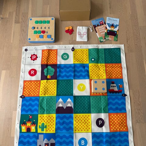 Learning Resources Code & Go Robotmus aktivitetsæt med byggeklodser og robotmus. Sættet indeholder forskellige elementer til at bygge baner og programmering af robotmusen til at følge specifikke ruter. Velegnet til børn til læring af grundlæggende programmering og problemløsning.