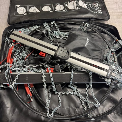 240 kæder til bilhjul med kædebredde på 16 mm. Passer til dækstørrelser fra 12" til 17" med specifikke dimensioner angivet på emballagen. Kæderne leveres i en rød opbevaringspose for nem transport og opbevaring.