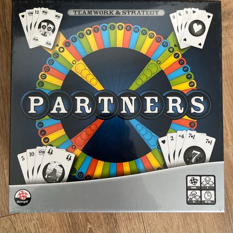 Partners brætspil med farverige spillebrikker og spilleplade. Spillet er designet til to eller flere spillere og indeholder elementer til strategisk spil.