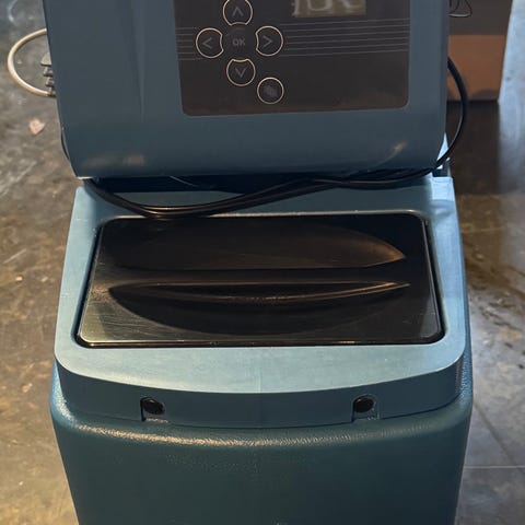 BWT vandbehandlingsanlæg med tilslutningsslanger. Enheden er udført i blå materiale og har en digital betjeningsenhed på toppen. Velegnet til installation i private hjem eller mindre erhvervsbygninger til forbedring af vandkvaliteten.