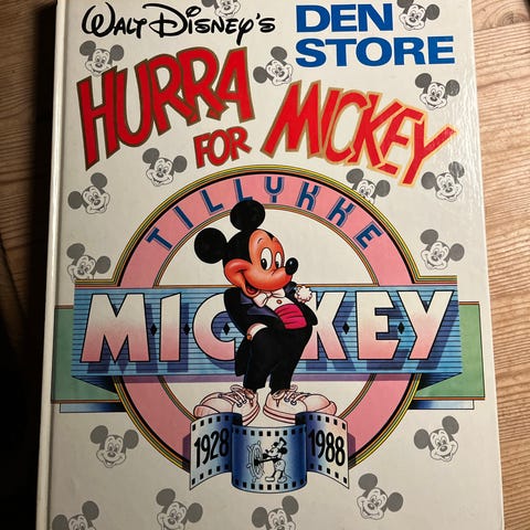 Walt Disney Mickey Mouse bog med titlen 'Den store hurra for Mickey'. Bogen indeholder illustrationer af Mickey Mouse og er designet til børn.