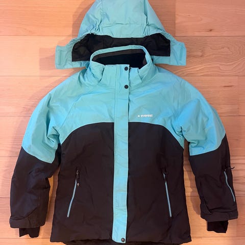 Skijakke i turkis til børn, størrelse 127. Jakken har hætte, lynlåslukning med velcro og justerbare ærmer. Der er snefang. Kun afhentning