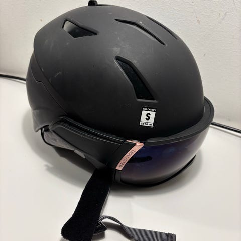 Salomon skihjelm i blå farve med ventilation. Hjelmen er designet til at beskytte hovedet under skiløb og andre vintersportsaktiviteter. Den har polstret indvendig for komfort og justerbar strop for sikker pasform. Post og original kasse medfølger.