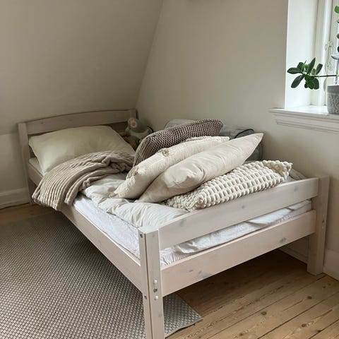 Flexa seng i træ. Sengen er designet til børn og har en robust træramme med afrundede hjørner. Den kan anvendes som juniorseng til børn, men måler 90x200 cm så voksne også kan ligge i den.