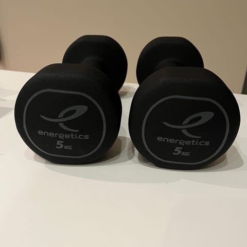 Energetics håndvægte sæt med to forskellige vægte: 2,5 kg og 5 kg. Håndvægtene er sorte og fremstillet til træning og styrketræning. Materialet er designet til at give et godt greb under brug.