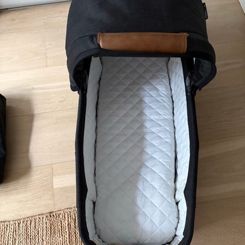 Emmaljunga NXT90 Lift i grå farve med brunt håndtag. Liftens materiale er slidstærkt og egnet til brug med Emmaljunga NXT90 barnevognsramme. Designet til spædbørn, giver en komfortabel og sikker plads til barnet under transport.