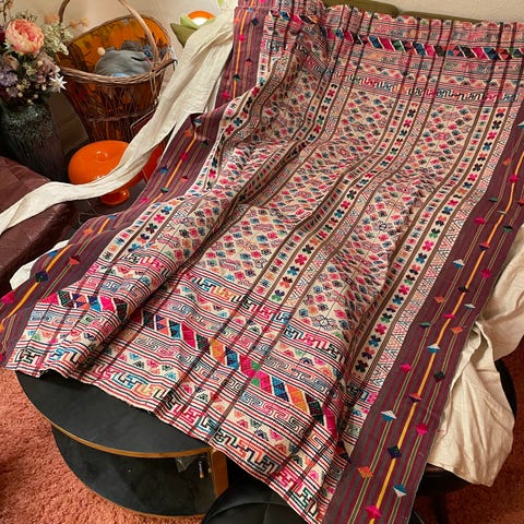 Smukt pojagi-gardin i blå og beige nuancer. Har fået det syet af en privat skrædder. MÆRKET I ANNONCEN ER IKKE RIGRIGT, men skulle væge noget
