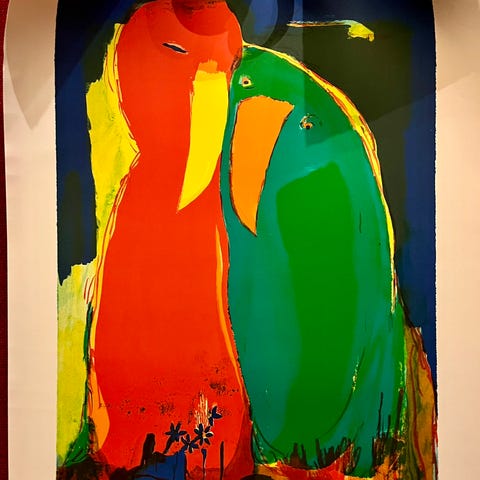 Sæt bestående af fire farverige abstrakte kunsttryk i hvide rammer. Motiverne indeholder forskellige geometriske og organiske former med klare farver som orange, gul, blå og rød. Kunsttrykkene varierer i størrelse og kan anvendes til dekoration af vægge i hjemmet eller kontoret.