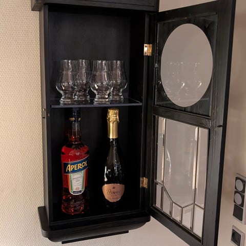 Barskab i sort og sølv. Indbygget spejl og lys.