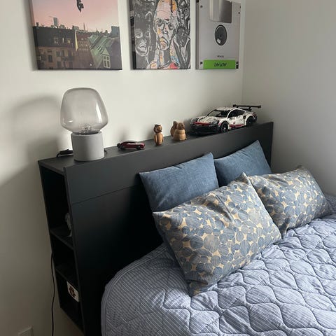 Fin sengegavl med udtræk i begge sider, hvor der er masser af opbevaringsplads