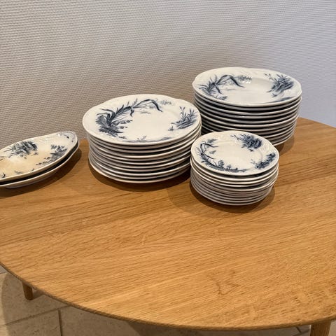 12 flade tallerkner, 12 dybe, 2 kartoffelskåle, 1 lågfad, 10 par kaffekopper, 11 kagetallerkener,