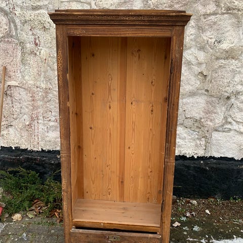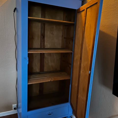 Karlekammerskab i en lys blå farve med 4 hylder.