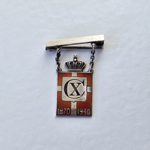 Kongenål / kongeemblem af sterling sølv med rød emalje. Til knaphul. Stemplet 925, GJ. Udgået fra Georg Jensen. Længde 2,5 cm. Vægt 3,3 gr.