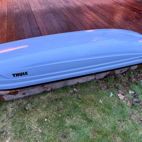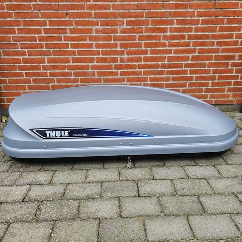 Thule Pacific 200 tagboks i grå farve. Tagboksen har en aerodynamisk form og er designet til at blive monteret på bilens tagbøjler. Den har lås med nøgle for sikker opbevaring af bagage og udstyr. Indeholder beslag til montering.
