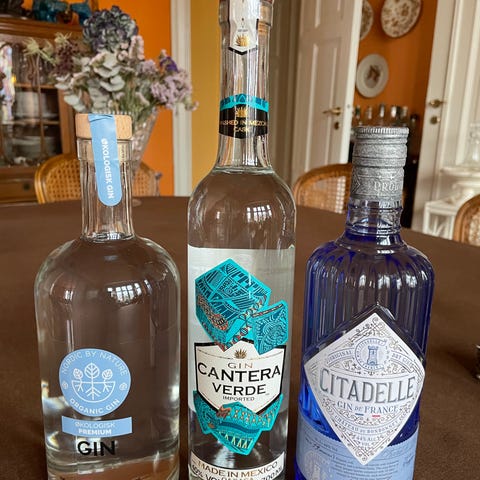 Wint & Lila Gin i en pink flaske. Flasken har et unikt design og indeholder gin med 43% alkoholvolumen.