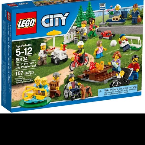 LEGO City 60134 park. Sættet indeholder bl.a. busstoppested, flere minifigurer i forskellige situationer, en barnevogn, en hund, græsslåmaskine og diverse småelementer som bænke og skilte. Den grønne plade medfølger også!