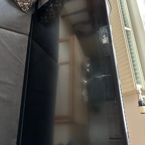 32" Samsung fladskærms-tv med vægbeslag. Tv'et har en sort ramme og er monteret på en justerbar vægarm.