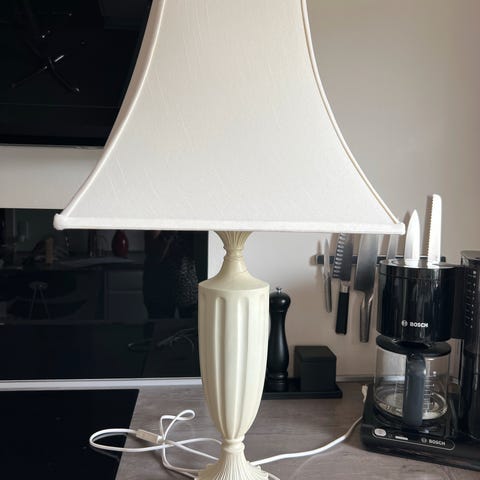 Unik fyrretræs bordlampe med en hvid ledning og afbryder. Lampen har en klassisk form og er drejet i fyrretræ. Den er velegnet til brug som bordlampe i forskellige rum.