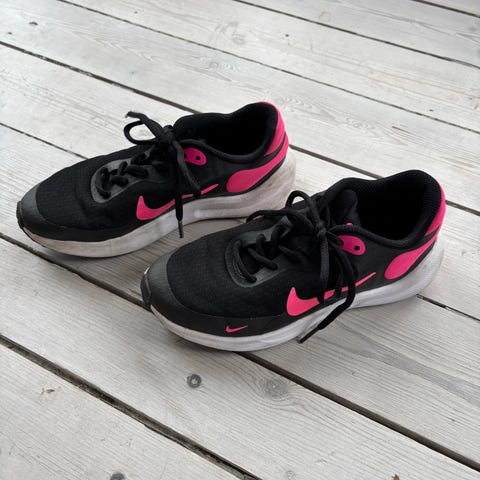 Nike kondisko / sneakers til pige i størrelse 31,5 i hvid og lyserød farve. Skoene lukkes med både snørebånd og velcrolukning for justerbar pasform. Næsten ikke brugt.