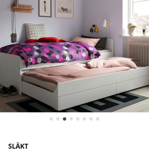 IKEA SLÄKT seng med udtræksseng og opbevaringsskuffer under. Sengen har en hvid ramme og lamelbund. Udtrækssengen kan trækkes ud for ekstra soveplads.