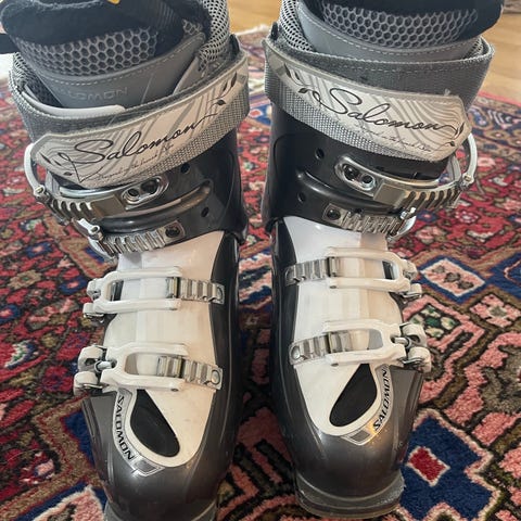 Salomon 70 skistøvler i størrelse 24,5. Som svarer til størrelse 38. Skistøvlerne er unisex og har en kombination af materialer, herunder tekstil og uld, med en hvid og lysegrøn farve. Modellen er udstyret med spænder og en justerbar rem for sikker pasform. Indvendigt er der en polstret foring med uldmateriale for komfort og varme. De er self. brugt, men fremstår rigtig fine og kan vil jeg mene passe til alle ski.