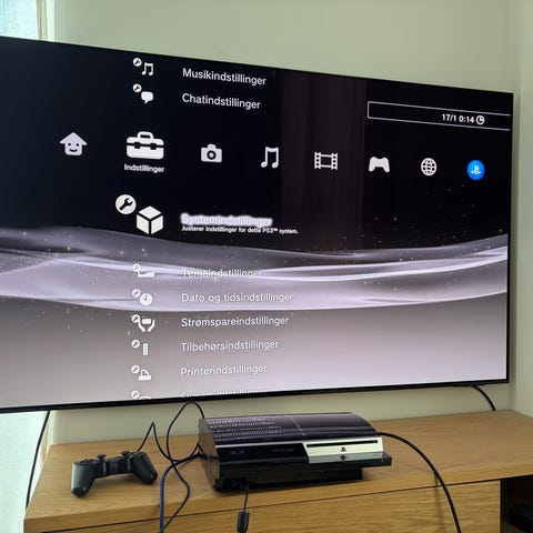 PlayStation 3 spillekonsol til gaming. Enheder tilsluttes for at spille forskellige spil designet til PlayStation-platformen.