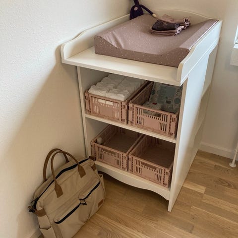 IKEA børnemøbel med flere skuffer i forskellige farver og en hylde. Møblet har en pusleplads med kanter for sikkerhed. Fremstillet i hvidt materiale. Velegnet til opbevaring og pusleplads til børn.