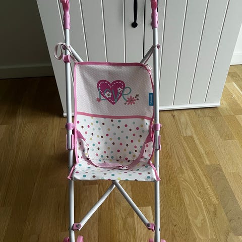 Hello Kitty træ legetøjsklapvogn i pink med hvide håndtag og gule hjul. Legetøjet er designet til børn og har et enkelt og robust design.